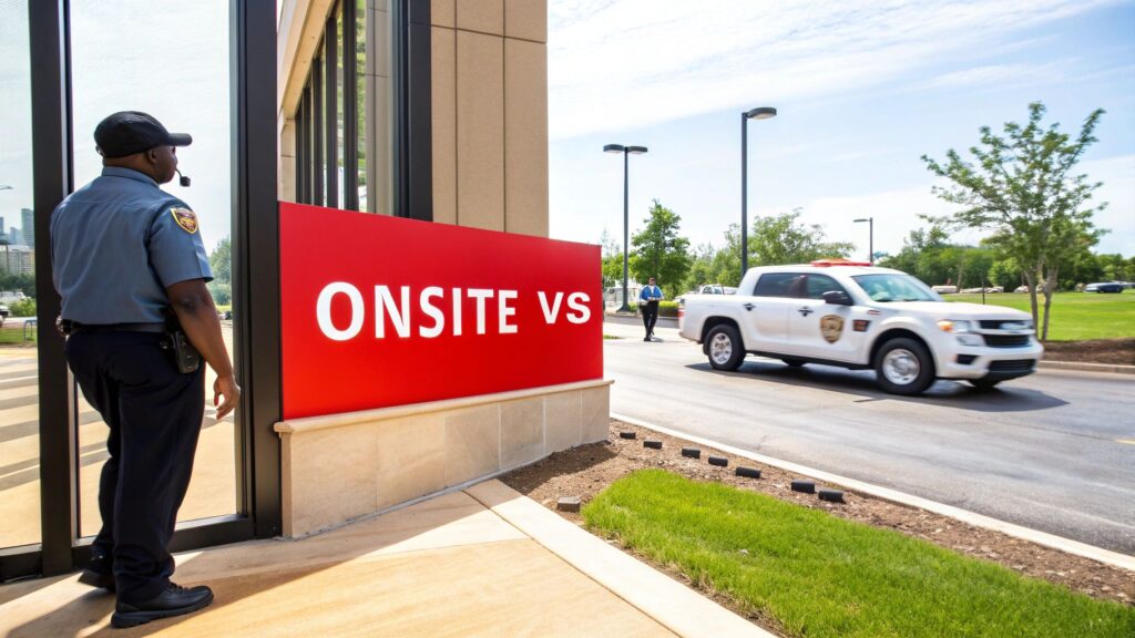 The most significant difference between the two is response time. An onsite security officer is already there, providing an immediate, real-time reaction to anything that happens. When an alarm goes off or a tenant reports an issue, there is zero delay. A trained professional is already on the scene, taking action. For high-risk environments where every second is critical, this is non-negotiable.